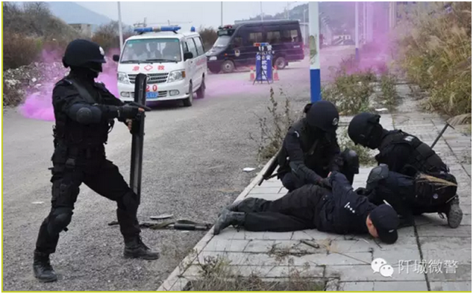 在演練現(xiàn)場,2名喬裝成警察的“歹徒”在通往一鄉(xiāng)鎮(zhèn)的公路上設(shè)卡,借口例行檢查,持槍對一輛有“鎮(zhèn)東護運”字樣的運鈔車實施“搶劫”,在與押運人員交談中,不料卻被押運人員識破其“詭計”,2名“歹徒”原形畢露,立即開槍射擊,就在這一瞬間,押運人員依法開槍將其中一名“歹徒”“擊傷”并迅速駕車至安全區(qū)域。同時,電話向警方報警求助。隨后,警方快速集結(jié)特警、巡警等30余名警力前往處置,通過喊話和政策攻心,2名“歹徒”仍然負(fù)隅頑抗,并向特警開槍。在勸說無效的情況下,指揮員下達對持槍“歹徒”采取強制措施的命令。歷時8分鐘,特警成功將2名“歹徒”制服并抓獲,隨即在醫(yī)護人員的幫助下,將“受傷”“歹徒”抬上救護車,送往醫(yī)院……