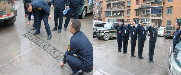 2015年12月11日,鎮(zhèn)東護(hù)運(yùn)有限公司黔東南州分公司組織天柱守押中隊(duì)在農(nóng)行大院舉行年終訓(xùn)練成果匯報(bào)暨反恐消防演練,并邀請了縣公安局治安大隊(duì)、縣銀監(jiān)局、縣人民銀行、縣工行、縣農(nóng)行、縣建行、縣電視臺(tái)等單位參加和觀看。訓(xùn)練成果匯報(bào)內(nèi)容主要包括反恐演練、隊(duì)列和擒敵術(shù)。反恐演練模擬運(yùn)鈔車在網(wǎng)點(diǎn)送鈔時(shí),押運(yùn)員遭遇歹徒徒手搶槍;運(yùn)鈔車網(wǎng)點(diǎn)收鈔時(shí),解款員提箱返回上車過程中遭遇歹徒持刀搶劫;![]()