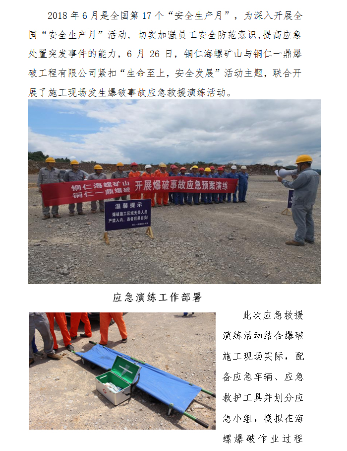 > 銅仁海螺礦山與銅仁一鼎爆破聯(lián)合開展“安全生產(chǎn)月”爆破事故 應(yīng)急救援演練活動