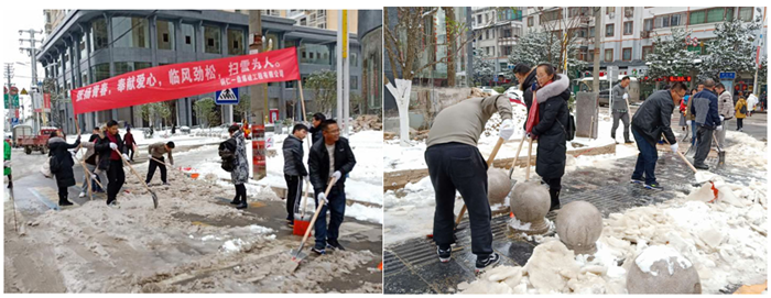 上午10點(diǎn),員工們頂著風(fēng)雪,陸續(xù)來到公司。在項(xiàng)目部張總的帶領(lǐng)下,大家不畏嚴(yán)寒,揮舞著鐵鍬開始對(duì)縣城風(fēng)雨橋附近的人行道及斑馬線的積雪和結(jié)冰進(jìn)行清掃。大家你追我趕,齊心協(xié)力,配合默契,鏟的鏟、推的推、掃的掃,干的熱火朝天,不亦樂乎,忙碌的身影構(gòu)成了一道亮麗的風(fēng)景線。雖然室外溫度很低,但大家勞動(dòng)的熱情和團(tuán)結(jié)的力量讓這個(gè)冬日變得格外溫暖。